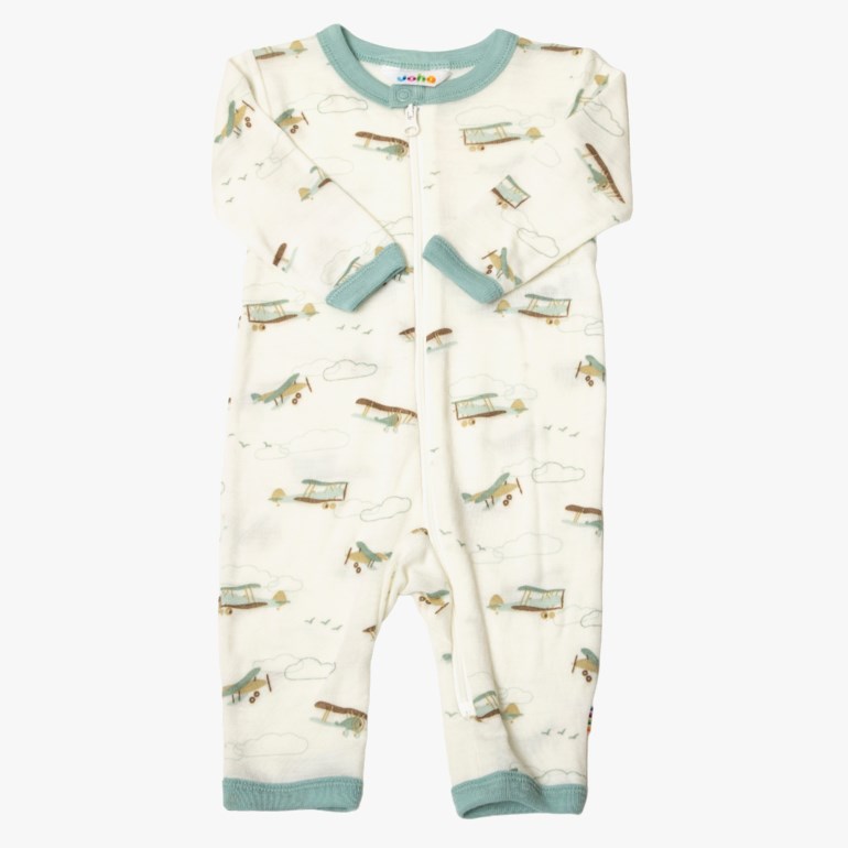 Heldress i ull med glidelås fra Joha. Deilig, myk og elastisk kvalitet hvor du har ullens unike egenskaper på utsiden og bomull på innsiden. Spesielt egnet for svært sensitiv hud. Laget med et søtt motiv og har kontrastfargede kanter.