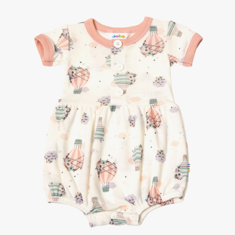 Sommerdress med korte armer og ben. Knappelukking og trykknapper mellom bena for enklere påkledning. En ribbet, myk og lett ullkvalitet med god strekkbarhet som er veldig behagelig å ha på. Søt trykk med kontrastfargede kanter. Ren merinoull og Oeko-tex 100 etikett.