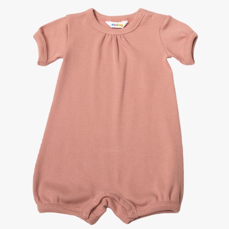 Sommerdress med korte ermer og ben. Søte puffermer og rynkeeffekt i halsen og i bena som søte detaljer. Trykknapp på den ene skulderen og mellom bena for enklere påkledning. En deilig myk og elastisk økologisk bomullskvalitet med fin struktur som er deilig å ha på seg. Øko-tex 100 etikett.