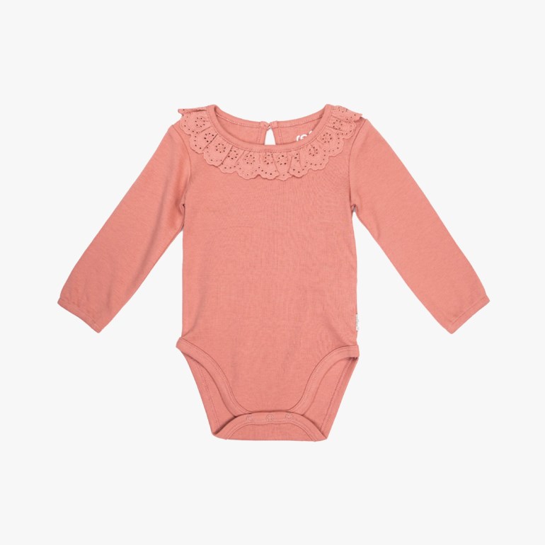 Denne nydelige, ensfargede bodyen med blonde- og rysjedetaljer er laget av 100% økologisk bomull, som sikrer at barnet ditt er komfortabelt hele dagen. Det stilrene designet med delikate detaljer gjør bodyen til et flott valg for både hverdags og spesielle anledninger.