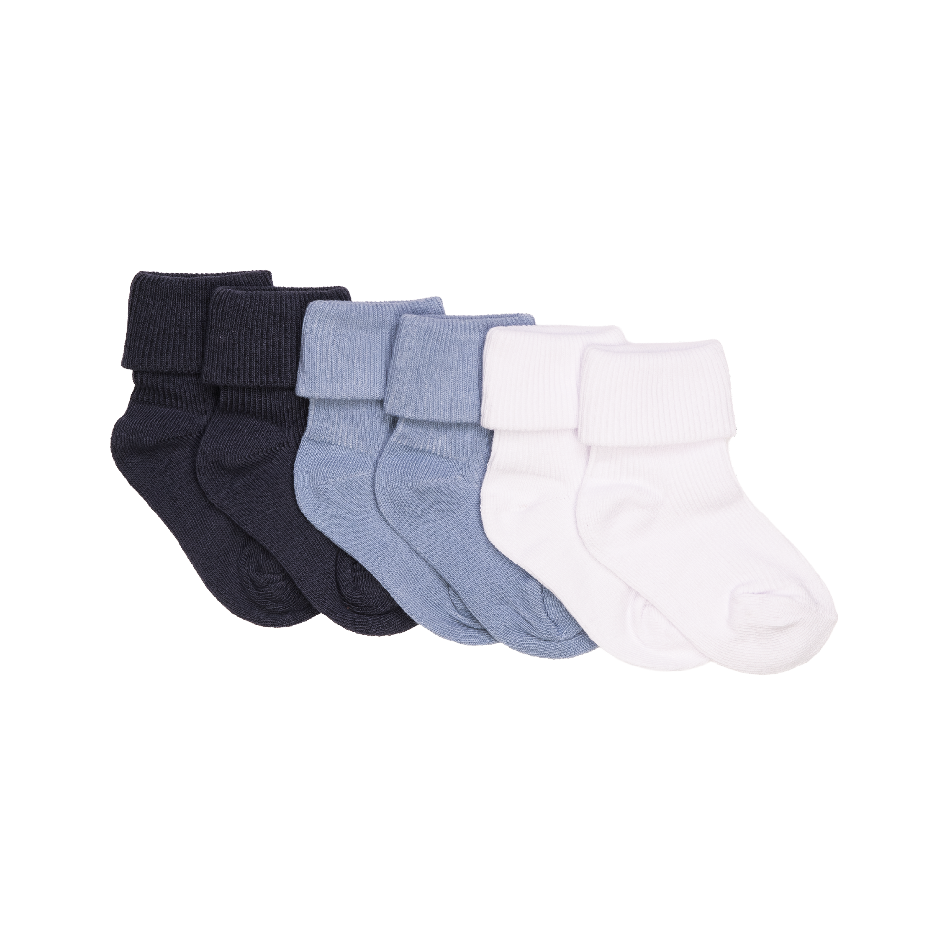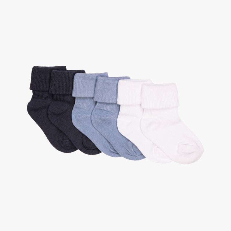 Ribbestrikk på foten og rundt ankelen sørger for at sokkene sitter godt på plass, og den nedbrettbare kanten gjør dem enkle å tilpasse etter behov. Med tre par i pakken og flere fargevarianter er dette et praktisk og pålitelig basisplagg i babyens garderobe.