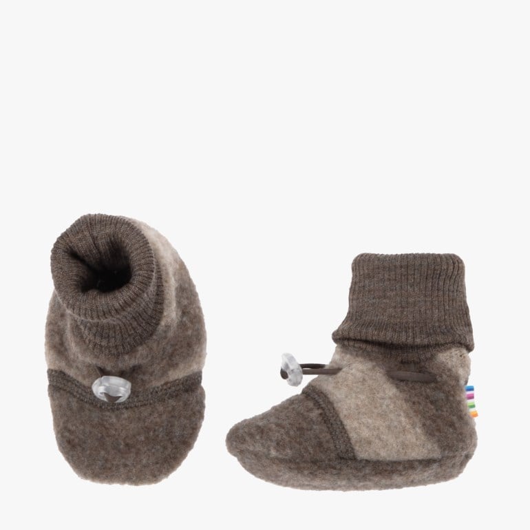 Varme og myke ullbooties i børstet merinoull som holder små føtter komfortable. De doble lagene gir ekstra isolasjon, mens snørestopp og brede ribbekanter sørger for at de sitter godt uten å stramme. Den lette ullkvaliteten er pustende og behagelig mot huden, og det stripete stoffet med ensfargede kanter gir et søtt og klassisk uttrykk.