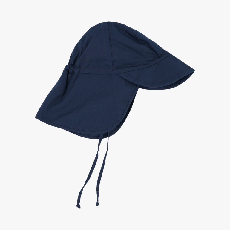 Med øreklaff og knyting som gjør at solhatten sitter ekstra godt på hodet.