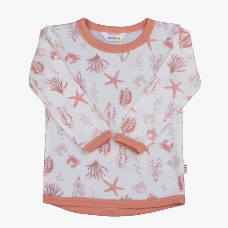 Langermet genser som er litt lengre bak enn foran. En ribbet, myk og lett ullkvalitet med god strekkbarhet som er meget behagelig å ha på. Søt trykk med kontrasterende kanter. Ren merinoull og Oeko-tex 100 etikett.