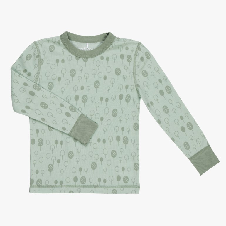 Helprintet ulltrøye laget av bambusviskose på innsiden og merinoull på utsiden. Denne kombinasjonen av materialer beskytter sensitiv og tørr hud mot irritasjon samtidig som man får godt utbytte av ullens gode egenskaper. Alle hals/ermer/fotåpninger i Nysnø-serien er laget av bomull slik at man unngår ull inn mot barnets hud.