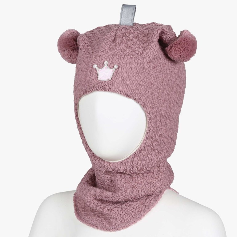 En vakker og varm balaclava i delikate rosetoner. KIVAT balaclava med kronemerke og dusker har et unikt vaffelstrikket mønster i 100 % ull, kombinert med mykt økologisk bomullsfôr som er skånsomt mot sensitiv hud. Litt elastan i fôret gir en fleksibel passform, mens ekstra varme ved panne og ører sørger for komfort på kalde dager. En reflekshempe bak gir økt synlighet når mørket faller på.