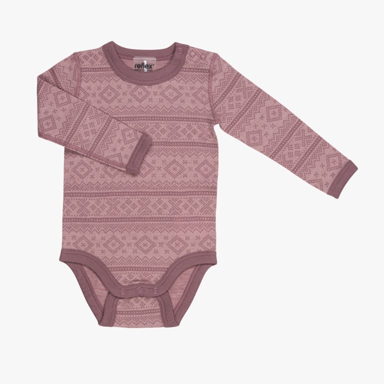 Vår mest populære mønstrete ullbody med jaquardstrikk laget av 100% merinoull. 100% myk og behagelig merinoull. Materialet varmer når det er kaldt og kjøler kroppen når det er varmt. Transporterer bort fuktighet og tørker hurtig. Åpning med trykknapper på ene skulderen og i skrittet. Leveres i fire fargekombinasjoner og matcher de andre produktene i Nordlys- Frost og Nysnø-seriene. Produktet er Økotex-sertifisert. Ullen er RWS-sertifisert & mulesing-fri for en mer bærekraftig produksjon. Str. 56 cm 1 mnd – 98 cm 3 år. Materiale: 100% merinoull. Vaskeanvisning: Maskinvask 40 grader, ullprogram. For å ivareta både plagget og miljøet så godt som mulig anbefaler vi å minimere antall vask så mye man kan. Vask gjerne av flekker med en klut og heng plagget til lufting når nødvendig. Dette vil forlenge levetiden på plagget, minimere energibruk samt skåne miljøet for unødvendig utslipp.