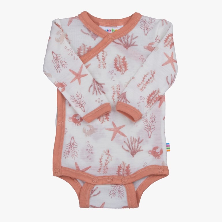 Langermet body med omslagslukking for de minste. Trykknapper mellom bena og diagonalt over magen for enklere påkledning. En myk og lett ullkvalitet med god strekkbarhet som er veldig behagelig å bruke. Søt trykk med kontrasterende kanter. Ren merinoull og Oeko-tex 100 etikett.