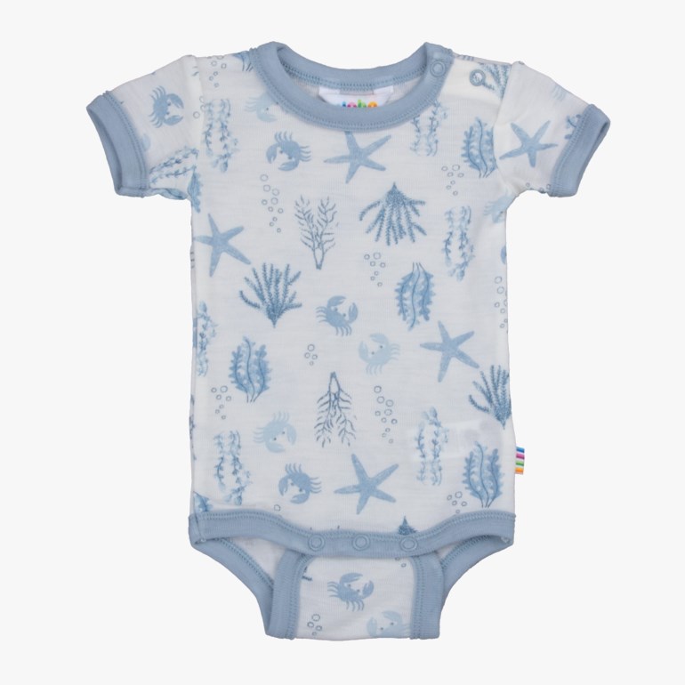 Langermet body med trykknapper på den ene skulderen og mellom bena for enklere påkledning. En ribbet, myk og lett ullkvalitet med god strekkbarhet som er fantastisk behagelig å bruke innvendig. Søt trykk med kontrasterende kanter. Ren merinoull og Oeko-tex 100 etikett.