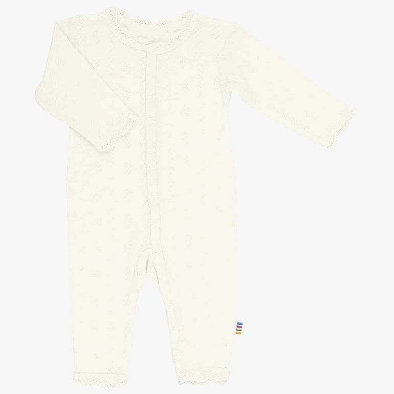 Denne heldressen kombinerer myk ull med silkens letthet og glans. Med delikate blondedetaljer og et søtt hullmønster gir den et eksklusivt uttrykk samtidig som den føles behagelig mot barnets hud. Trykknapper hele veien ned på det ene benet gjør påkledningen enkel.
