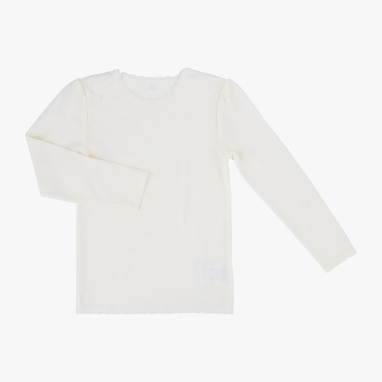 Ensfarget, langermet trøye med blonder med bambusviskose på innsiden og ull på utsiden. Denne kombinasjonen av naturmaterialer beskytter sensitiv og tørr hud mot irritasjon samtidig som man får godt utbytte av ullens gode egenskaper