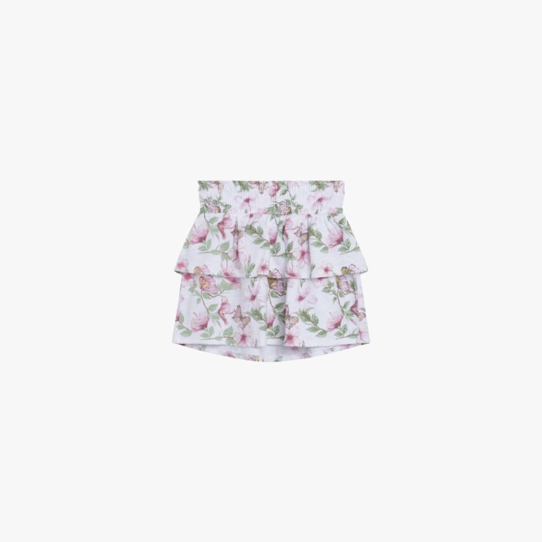 Skjørt i elastisk, melert jersey med blomstertrykk. Modellen har elastisk vaffelsøm i livet og to lag volanger. Dette produktet er sertifisert med GOTS (Global Organic Textile Standard).
