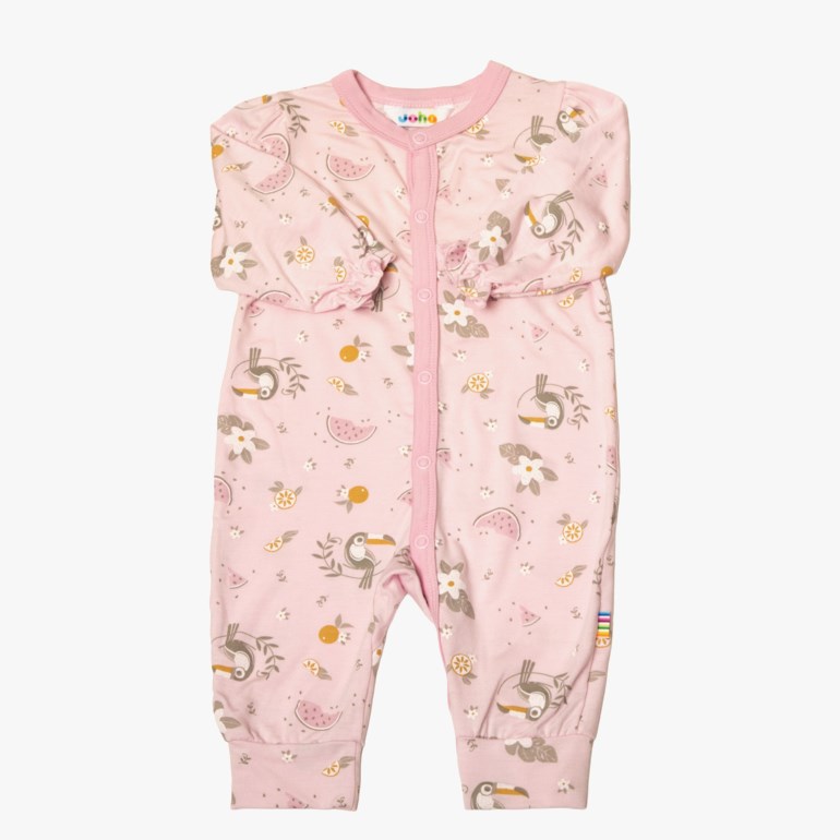 Fin heldress fra Joha, som lukkes med trykknapper foran og ned gjennom det ene beinet for enkel påkledning. Pysjamasen har puffermeeffekt ved skuldrene som en søt detalj, og er laget i en ekstra myk og deilig kvalitet basert på økologisk bambus. Kvalitetens strekkbarhet og mykhet gjør den herlig behagelig å ha på.