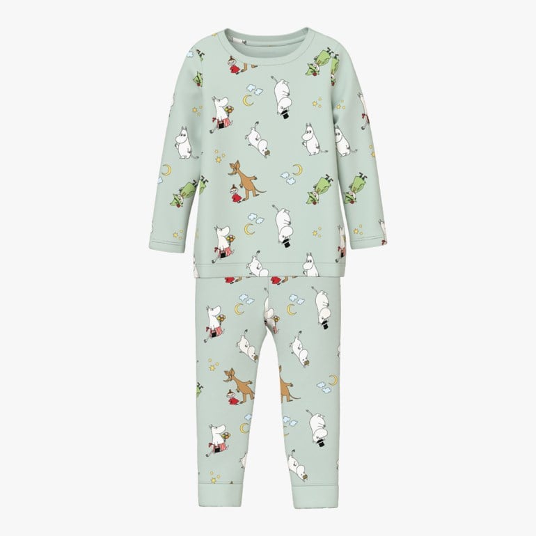 Et mykt og behagelig nattsett i elastisk jerseykvalitet som gjør leggetiden ekstra hyggelig. Stoffet er lett og pustende, med en myk overflate som føles deilig mot huden. Nattsettet har et lekent print over hele og elastisk linning i buksen for komfort gjennom hele natten. Perfekt for både søvn og rolige morgener.