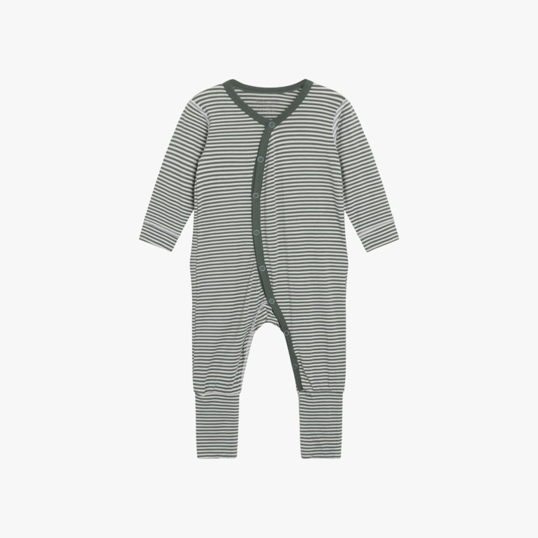 Langermet heldress i elastisk bambusjersey med striper. Dressen kneppes lettere asymmetrisk fra halsen og ned til venstre fot. Ved føttene er det påsatt en foldefot som man kan få foten gjennom, men som også kan foldes og brukes som en sokk. Det er foldefot opp til størrelse 86.Dette produktet er Oeko Tex 100 sertifisert.