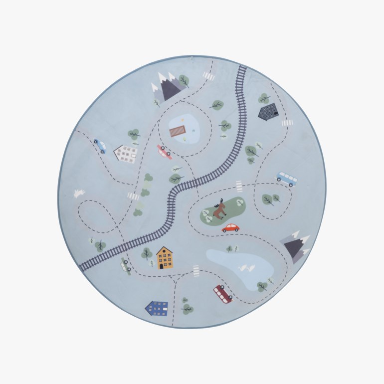 Gulvteppe i 100 % polyester, dekorert med bilveier og togbaner som kan brukes i lek. Baksiden av teppet har antiskli, slik at det sitter godt på gulvet. Perfekt som både leketeppe og gulvteppe på barnerommet.