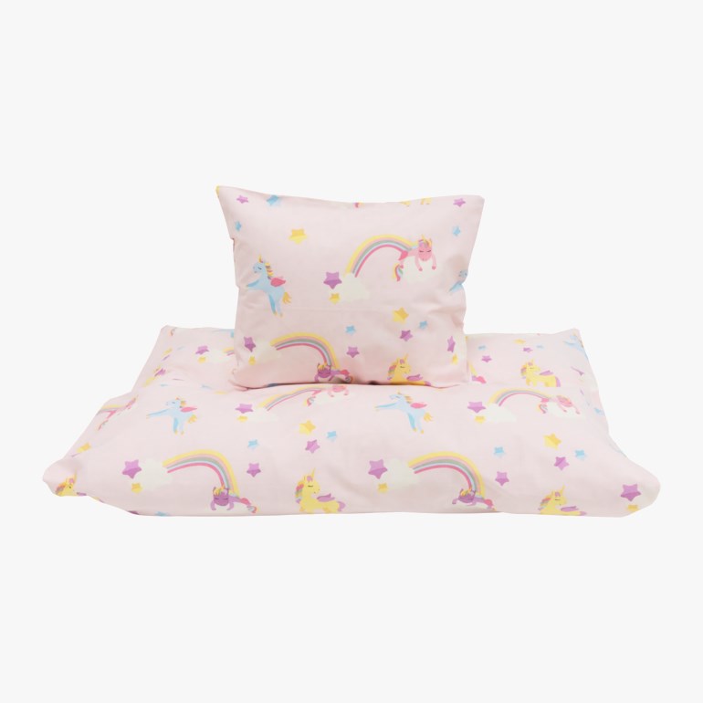 Sengesett i 100 % myk og deilig bomull, dekorert med søte enhjørninger og regnbuer.