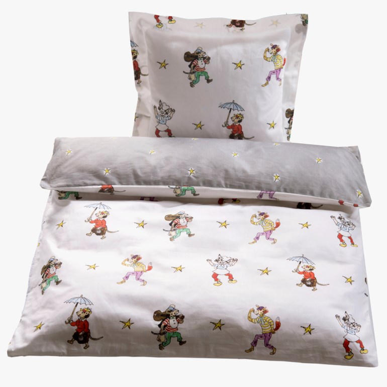Sengesett i ren bomull bomull m motiver fra Thorbjørn Egners Hakkebakkeskogen på dynetrekket. Tosidig putevar m trykk. Bunnåpning. Finnes kun i hvitt med trykk i multi farger foran og grå bakside. Fåes i str. 65x80, 80x100 og 100x140 cm. Del av en serie. Vaskes v 60 gr. Bør ikke vaskes sammen med frotte pga nupping. Lufttørking er bedre enn tørketrommel