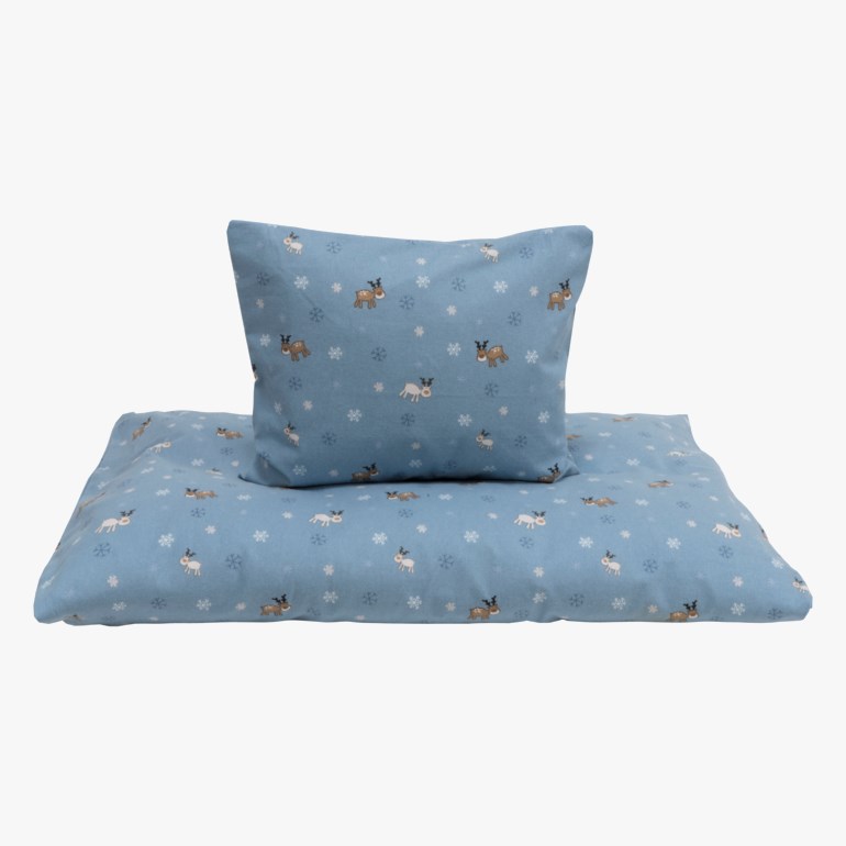 Fargerikt sengesett i myk og deilig bomullsflanell. Dekorert med reinsdyr og snøflak - perfekt til jul!