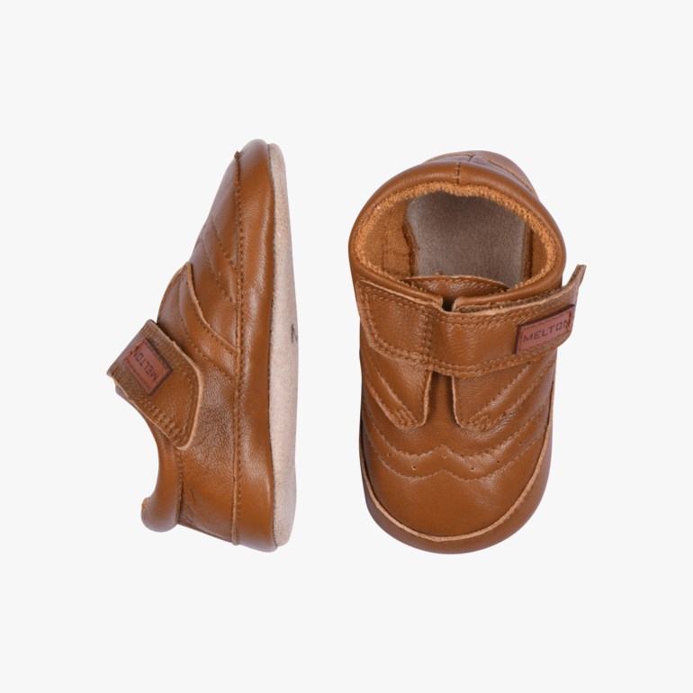 Melton skinntøffel med borrelås som gjør den enkel å få på. Innside foret med bomull, skinnsåle under.