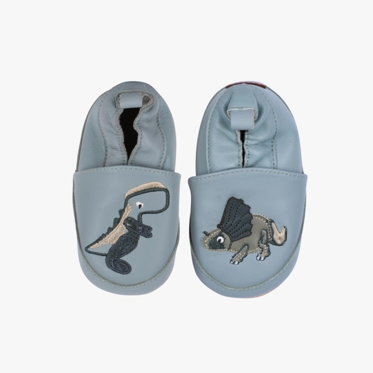 Melton skinntøffel med dinosaurus motiv. God elastikk gjør at den sitter godt på foten. Innside foret med bomull, skinnsåle under.