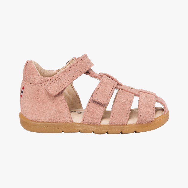 Sandalen er håndlaget i Europa av slitesterkt skinn som former seg mykt rundt foten og lar huden puste. Det myke skinnfôret beskytter sensitiv barnehud, mens den fleksible passformen gir god bevegelsesfrihet. En solid yttersåle i gummi sørger for stabilitet og godt grep på ulike underlag, og gjør sandalen godt egnet som første sommersko.