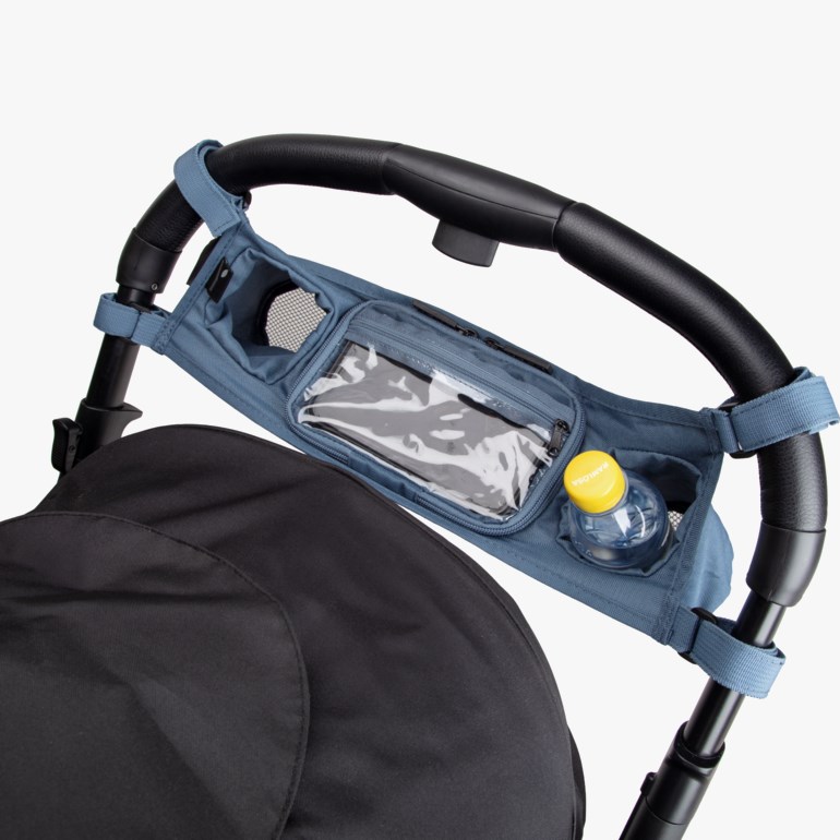 Organiseren har to koppholdere til flasker eller krus, en gjennomsiktig mobillomme som beskytter telefonen mot fukt samtidig som skjermen er synlig, og en stor hovedlomme til små nødvendigheter som nøkler, smokk eller lommebok. Perfekt når du vil ha alt lett tilgjengelig på tur.