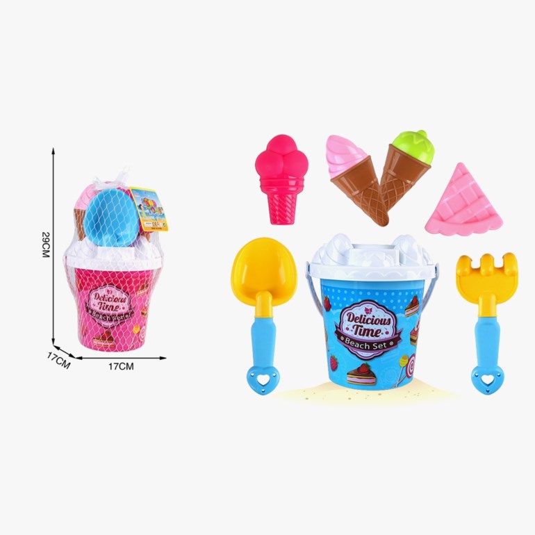 Fargerikt bøttesett med iskremformer, perfekt til lek både i sand og i vann. Inkludert er en bøtte med lokk, en rake, spade og fire iskremformer av forskjellig slag.