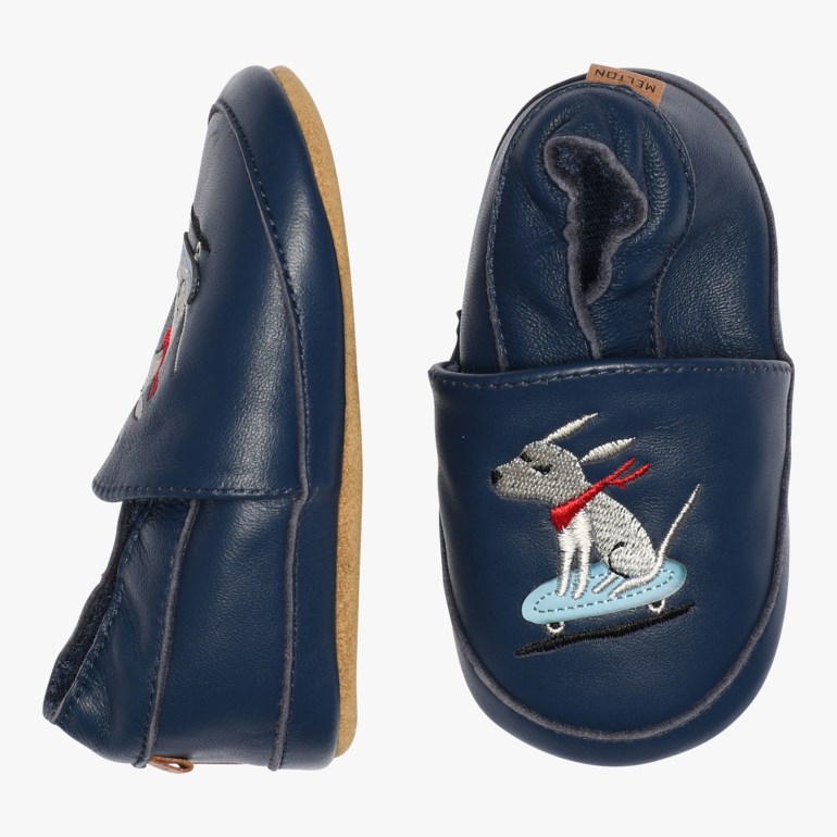 Oppdag komfort og stil med MELTONs skinntøfler med bred passform, med kule skater-hundebroderier.
