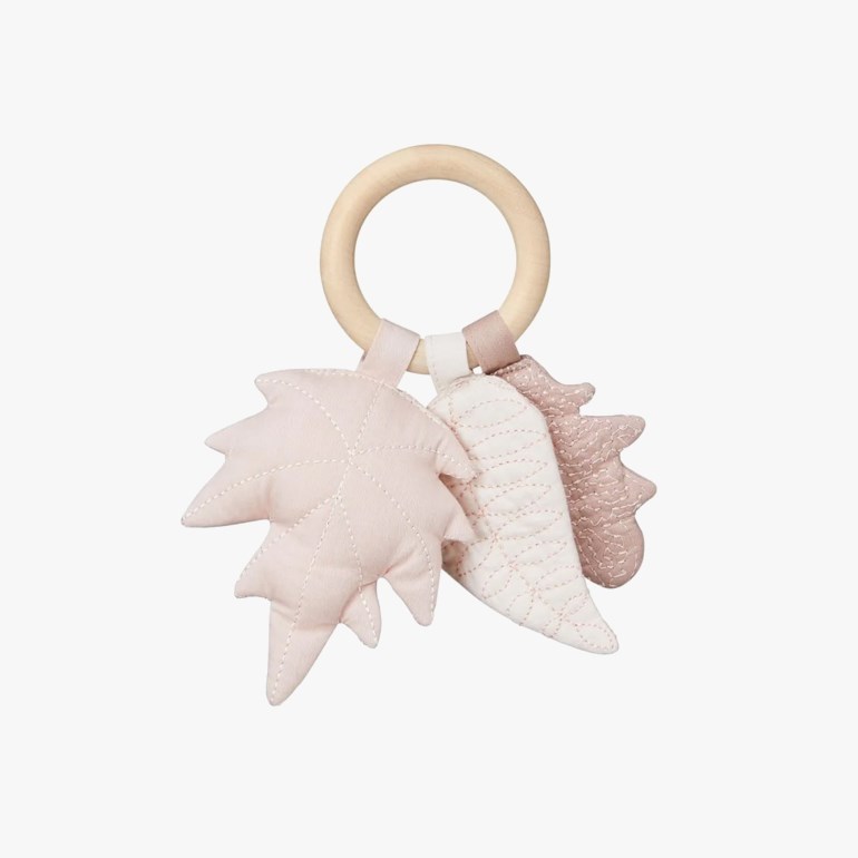 Denne søte ranglen er designet for å fange babyens oppmerksomhet og stimulere sansene. Tre blader med ulike teksturer og lyder, som knitring og bjelle, gjør leken både spennende og utviklende. Den glatte treringen i ahorn er enkel for små hender å gripe, og bladene har et unikt, håndlaget broderi som gir ekstra detaljer til utforskningen.