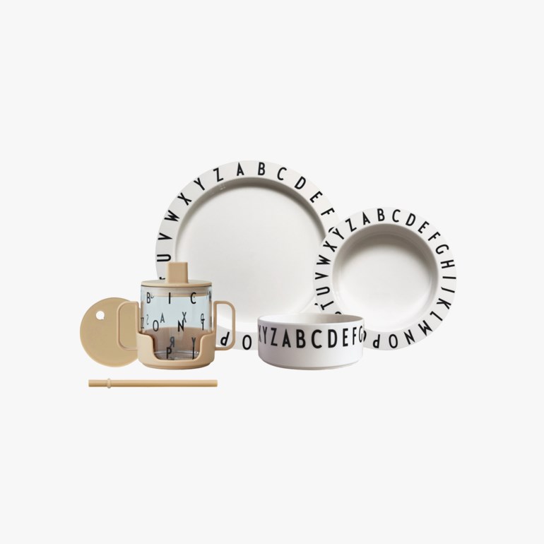 Stilrent gavesett i tritan fra Design Letters, basert på EAT & LEARN-filosofien og stimulerer barnas læring mens de spiser og drikker. I settet får du flat tallerken, dyp tallerken, bolle og kopp med håndtak, tutekopplokk og også et lokk med sugerør. Alt barnet trenger til mat og drikke fra det er baby og opp til skolealder. Produktene har et stilig, grafisk utseende og passer perfekt til både frokost, middag og lunsj. Tritan er uknuselig, det tåler oppvaskmaskin og mikro og utseendet på overflaten forblir som ny, selv etter flere ganger i vask. En plastikk av medisinsk kvalitet som betyr at det er 100 % trygt for barn å spise og drikke fra.