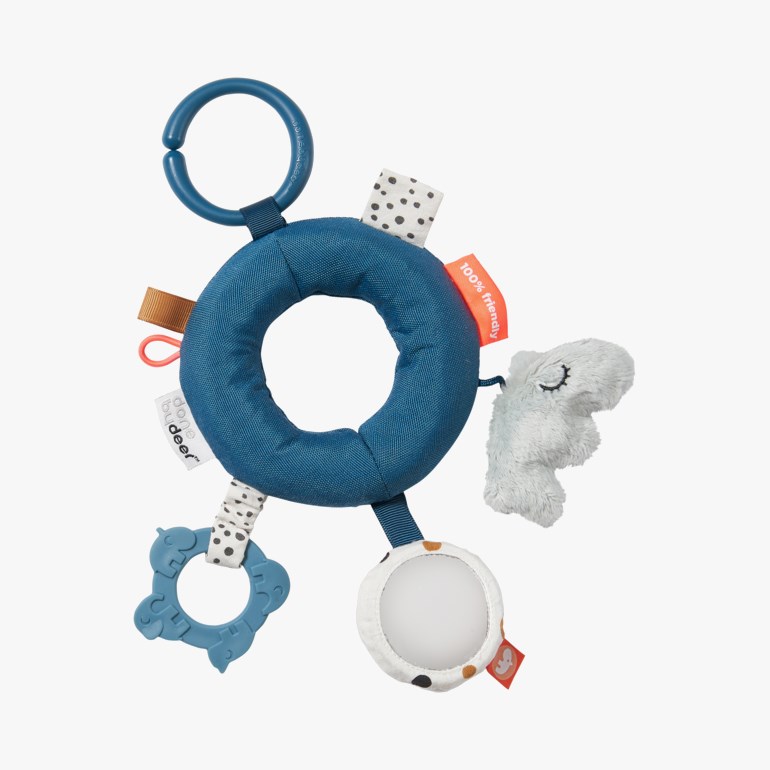 Denne myke aktivitetsringen er en stimulerende leke som vekker babyens nysgjerrighet og sanser. Den kombinerer flere elementer: en myk biteleke som lindrer såre gommer, et trygt speil med ranglelyd, teksturerte overflater og morsomme knitrelyder.