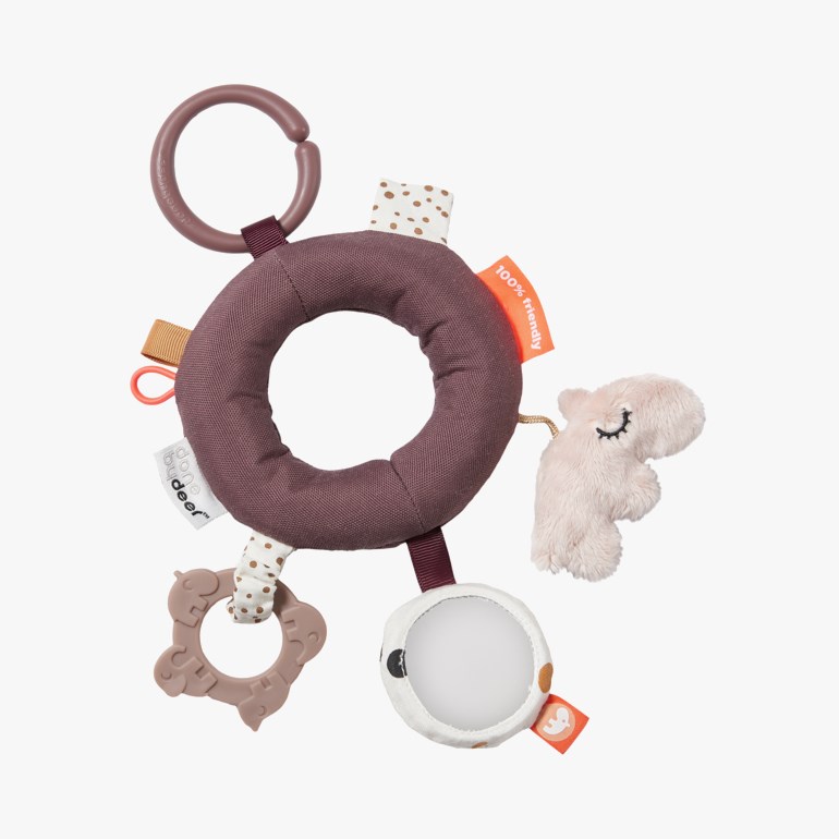Denne myke aktivitetsringen er en stimulerende leke som vekker babyens nysgjerrighet og sanser. Den kombinerer flere elementer: en myk biteleke som lindrer såre gommer, et trygt speil med ranglelyd, teksturerte overflater og morsomme knitrelyder.