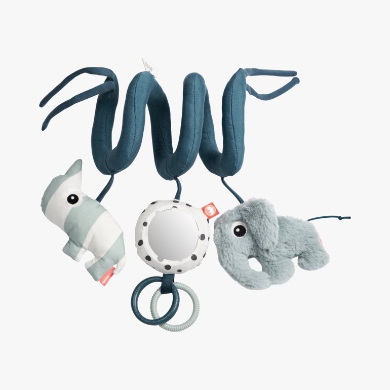 Den fleksible aktivitetsspiralen kan monteres på de fleste steder, til og med på mor eller fars arm. Spiralen er utstyrt med flere aktivitetsleker, som aktiviserer barnet samtidig som barnets sanser stimuleres. - Myk å ta på. - Lett ranglende lyd. - Forskjellige teksturer og strukturer som gir barnet flere forskjellige opplevelser og utfordringer. - Lite speil for nysgjerrige øyne med biteringer for såre gummer. - Kan monteres både til sengen, bilsetet og vognen. - Materale: - Spiral: 100% polyester. - Leker: 100% bomull. - Fyll: Polyester fibre. - Biteringer: PP. - Rengjøres med fuktig klut. Kan ikke maskin- eller håndvaskes. - Mål: 15-33 cm x 10 cm.