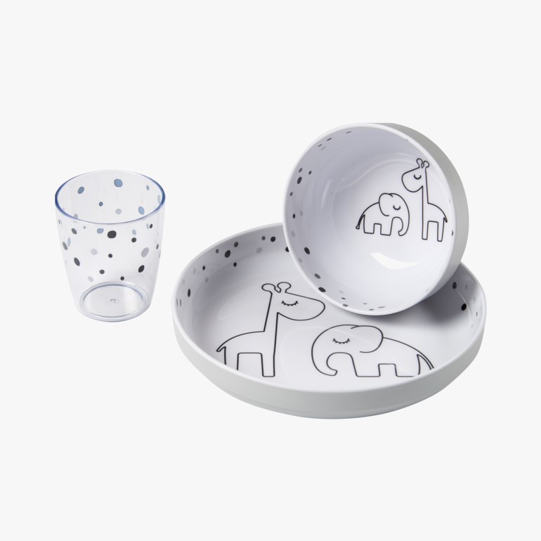 La Elphee og Raffi være dine venner under måltidene. Middagssett designet for de små med avrundede kanter slik at maten blir enklere å få med og i seg. Det søte Dreamy Dots-designet gjør dette middagssettet til den perfekte gave. - Inkluderer tallerken, skål og et lite glass. - Kan vaskes i oppvaskmaskinen. - Mål: Tallerken: 18,5 x 3 cm. Skål: 11,5 x 5 cm. Glass: 6,5 x 7,5 cm (kapasitet 120 ml). - Materiale: Tallerken og skål: 100% melamin. Glass: 100% akryl. - Kan ikke benyttes i mikrobølgeovn.