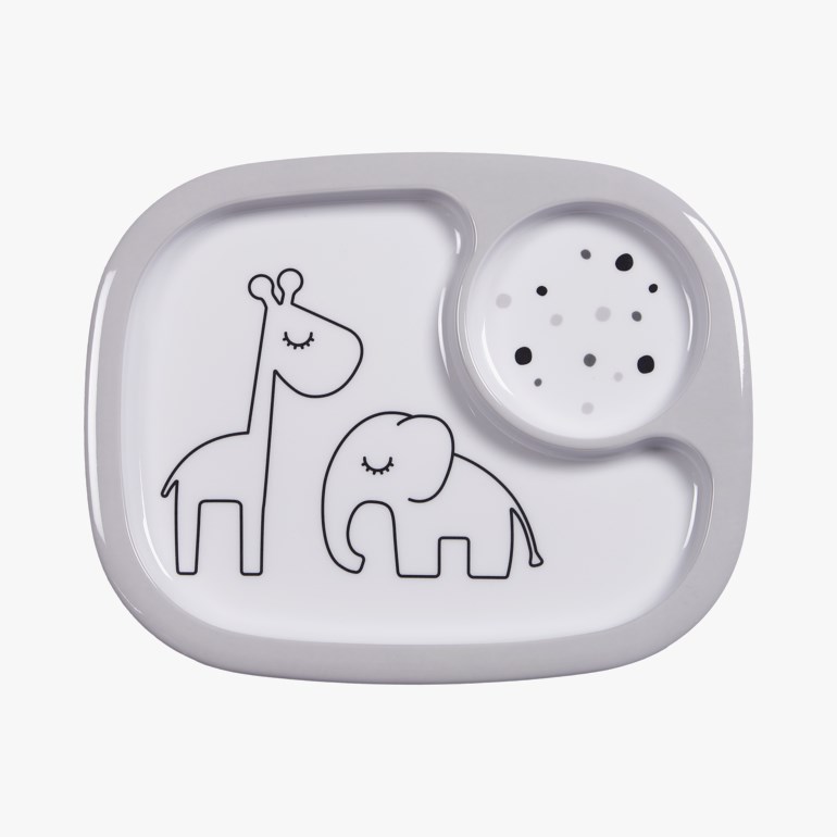 La Elphee og Raffi være dine venner under måltidene. En smart tallerken med oppdelte rom som skiller maten, akkurat slik de små kresne liker det. - Kan vaskes i oppvaskmaskinen opp til 70 °C. - Mål: Tallerken: 19,5 x 15 x 1,8 cm. - Materiale: 100% melamin. - Kan ikke benyttes i mikrobølgeovn.