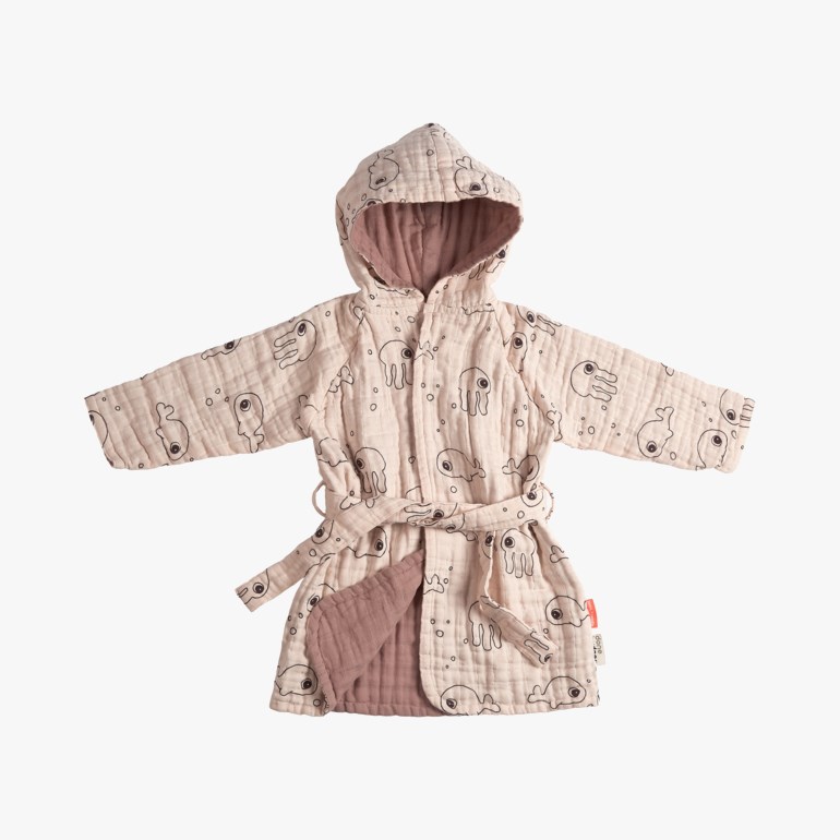 Velkommen under overflaten med sjøvennene Jelly og Wally, og dykk ned i et hav av myke muslin badtekstiler. Få den lille tørr og varm etter badetid, eller bare ren kos i badekåpen og den koselige hetten på en rolig helgemorgen. - Lett og glatt på huden og lett å bevege seg i. - Det praktiske midjebeltet sørger for at badekåpen holder seg på plass. - Mykner enda mer når den vaskes. - Oeko-Tex-sertifisert. - Materiale: 100% bomull. - Kan maskinvaskes på 30°. - Lengde: 50 og 60 cm. - Anbefalt alder: 1-2 år og 3-4 år.