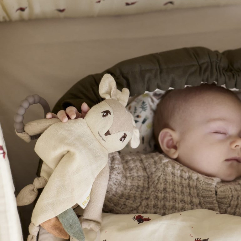 Freya har et vennlig brodert ansikt som fanger babyens oppmerksomhet, mens biteringen i myk silikon lindrer såre gommer når tennene begynner å komme. Kosekluten kan enkelt vaskes i maskin, og blir raskt en fast følgesvenn i både vogn og seng.