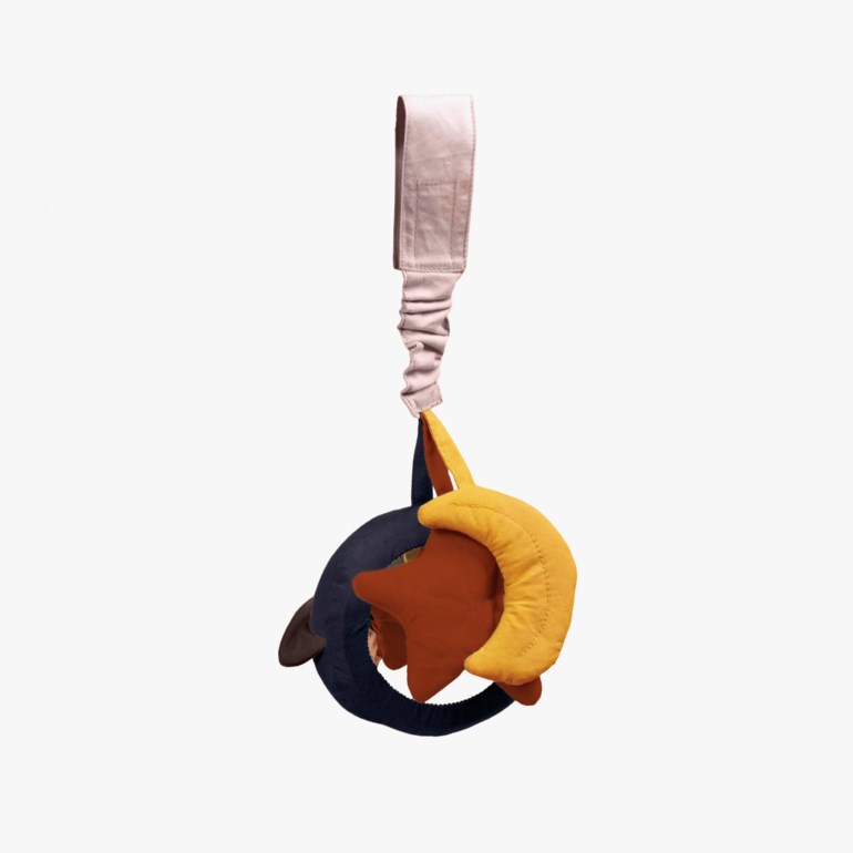 Stropp med borrelåsstenging slik at den kan henges på aktivitetsstativ/babygym, barnevogn eller seng.