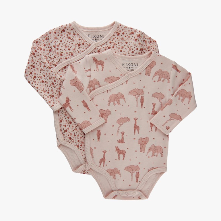 2pk omslagsbody med mønster. Den ene bodyen har allover print, og den andre har frontprint. 100 prosent bomull.