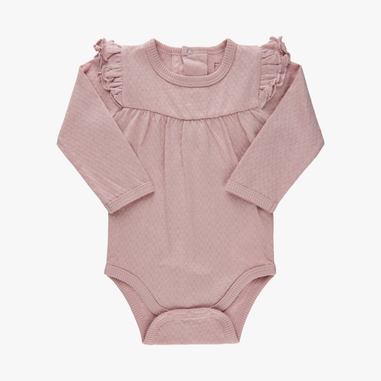 Body fra FIXONI. Bodyen har lange ermer og rysjer på skuldrene. Flott hullmønster og ribbkanter ved hals, håndledd og ben. Trykknapper på skulderen og mellom benene. Fargen er rosa. 100 prosent økologisk bomull. Kommer i str. 50-74.