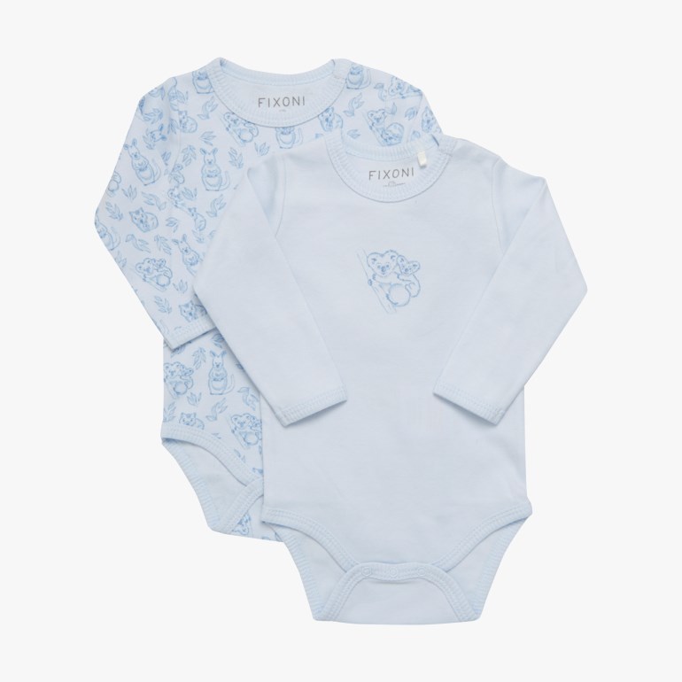 2pk body med lang erm. En body som er helmønstret og en som er ensfarget med motiv foran. Bodyerne har ribkant ved hals, håndledd og ben. De lukkes med trykknapper mellem benene og ved skulderen. De kommer i str. 50-74 i lysblå. De er laget av 100 prosent økologisk bomull.