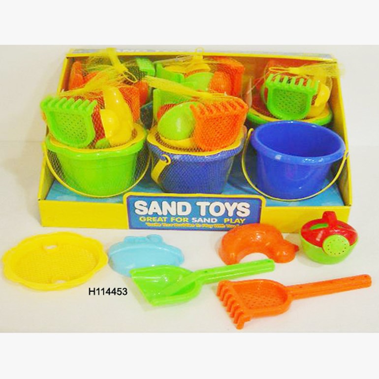 Bøttesett med forskjellige strandleker. Kommer i fargene rød, grønn og blå.