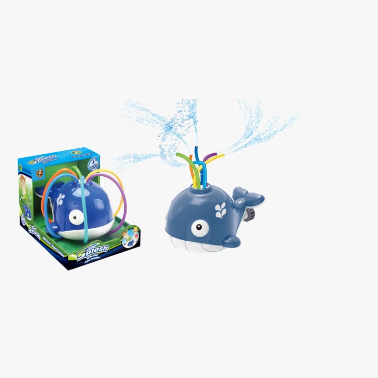 Vannspreder i artig hval-design. Toppen på hvalen spinner rundt slik at vannet slynges i alle retninger. Spruter langt, og kobles til vanlig hageslange.