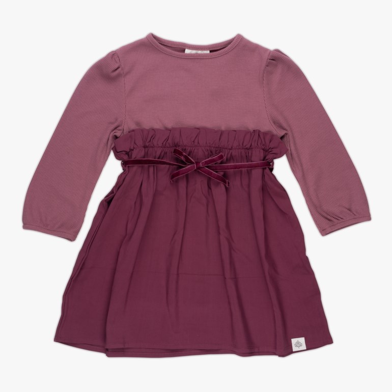 En nydelig selskapskjole med snurreskjørt i verdens mykeste stoff. Elastisk midje med velourbånd, og søte rysjedetaljer på skuldrene. Kjolen er lett og behagelig å ha på, og kan like gjerne brukes i barnebursdag som til finere selskaper. Eksklusiv for dette sesongen, og finnes kun i et begrenset opplag.60 prosent polyester, 35 prosent viskose og 5 prosent elastan. 100 prosent viskose. Oeko-Tex 100 sertifisert