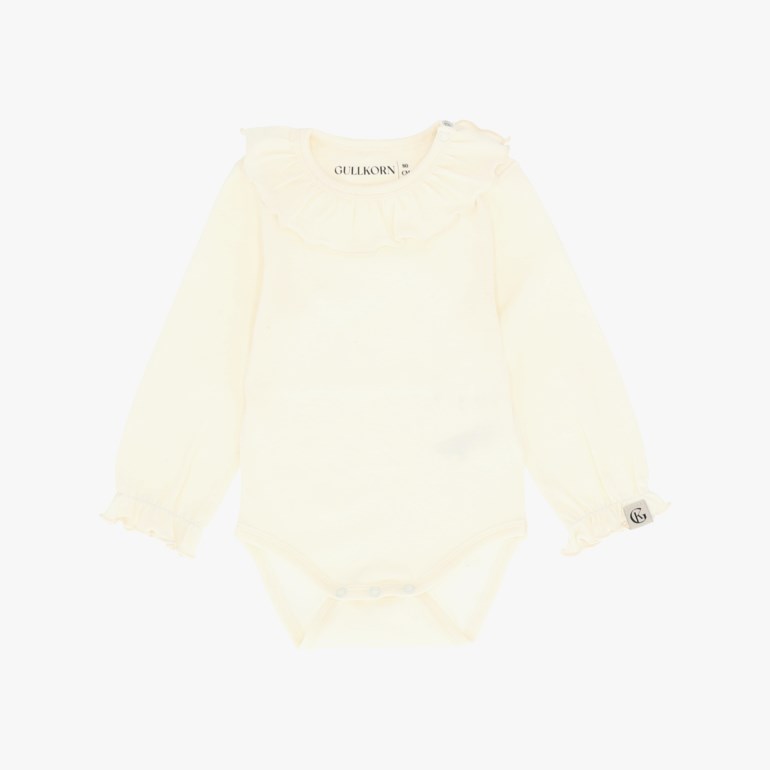 En superfin og myk body til de aller minste, med søte detaljer i krage og ermer. Bodyen har trykknapper i nakken og bunn. Enkel å ta av og på, med mye plass til hodet. Bomullskvaliteten er lett, puster godt og har kjempegod stretch, noe som gjør den behagelig til både lek, og i de små pausene.