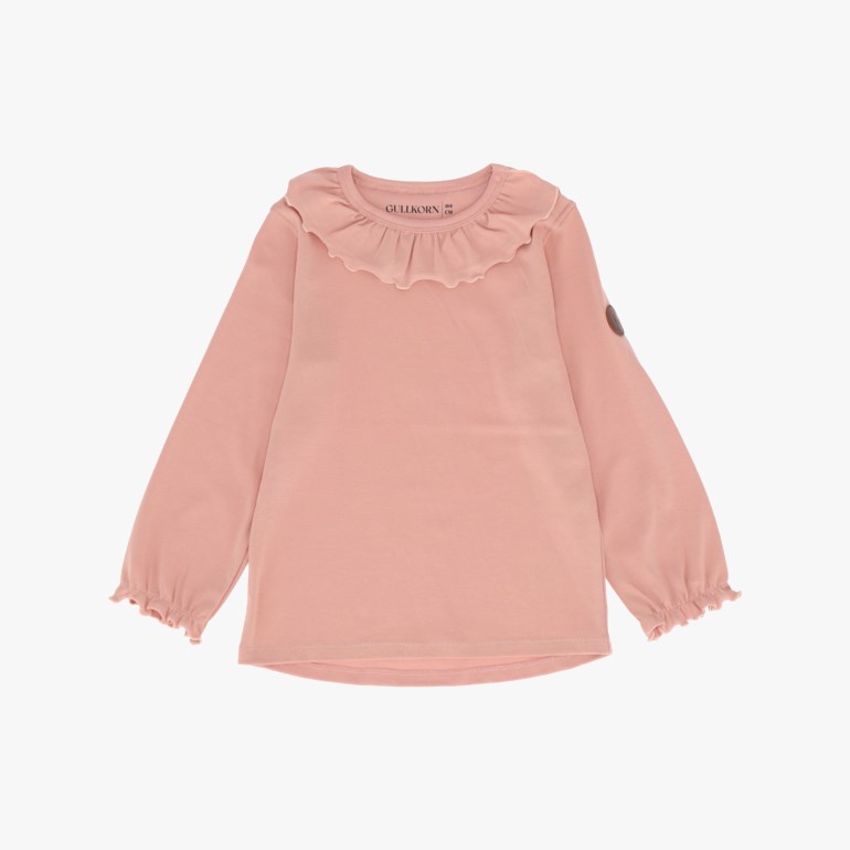 En superfin og myk genser, med søte detaljer i krage og ermer. Nydelig til finere anledninger, men også til hverdagsbruk. Genseren har trykknapper i nakken, og er enkel å ta av og på, med mye plass til hodet. Bomullskvaliteten er lett, puster godt og har kjempegod stretch, noe som gjør den behagelig til både lek og som innerste lag.