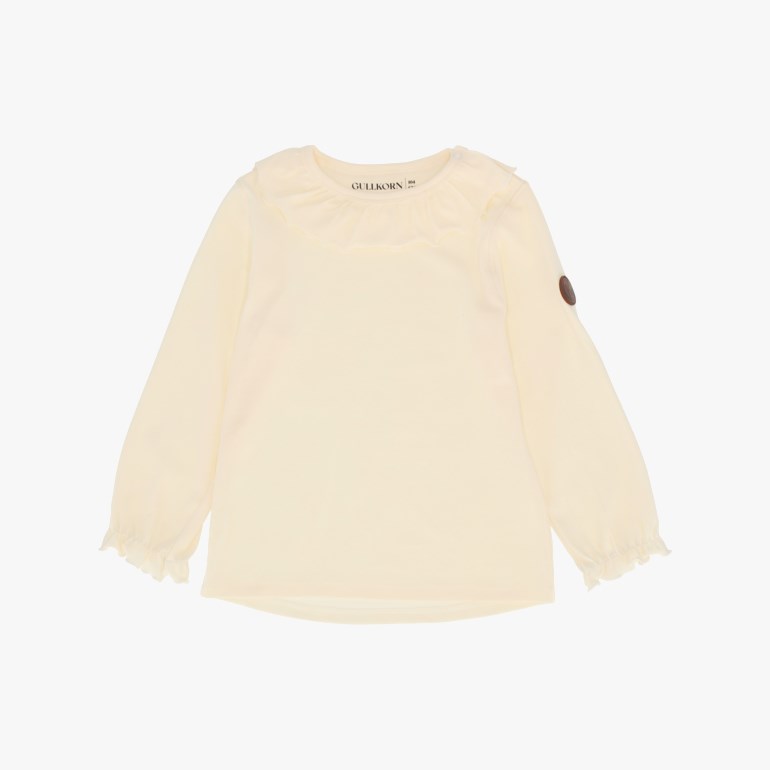 En superfin og myk genser, med søte detaljer i krage og ermer. Nydelig til finere anledninger, men også til hverdagsbruk. Genseren har trykknapper i nakken, og er enkel å ta av og på, med mye plass til hodet. Bomullskvaliteten er lett, puster godt og har kjempegod stretch, noe som gjør den behagelig til både lek og som innerste lag.