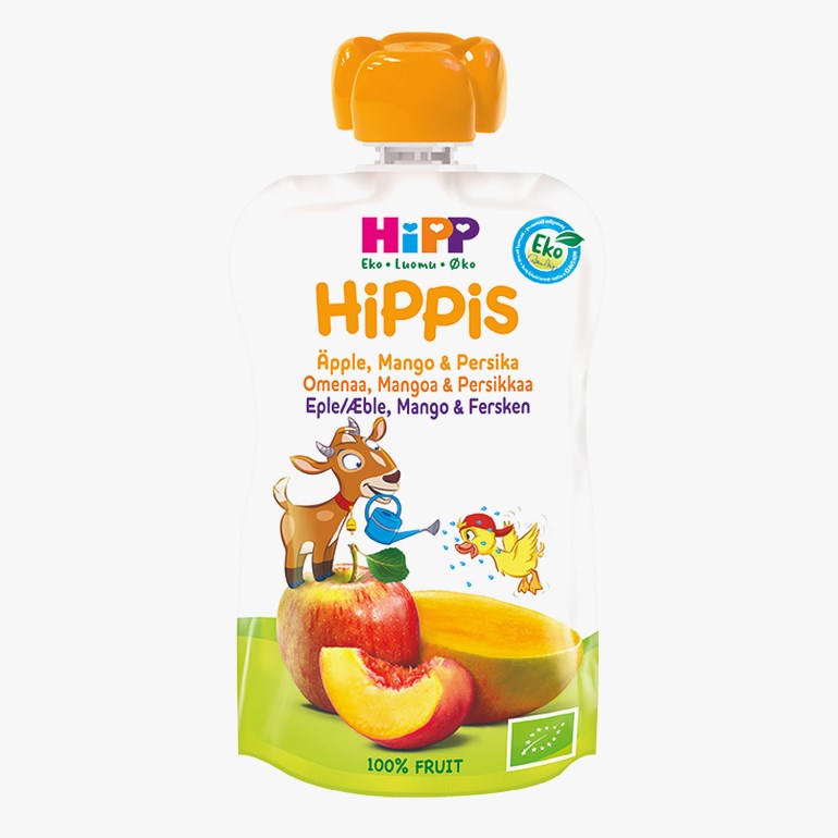 Smoothie Hippis eple, mango, fersken er kun laget av de beste økologiske råvarene og utgjør det perfekte mellommåltid eller dessert om du skulle være hjemme eller på farten. Egnet fra 4 måneders alder. Etter åpning oppbevares forpakningen utilgjengelig for barn og kan stå 24 timer i kjøleskapet med kork. Både kork og pose sorteres som plast i kildesorteringen. størrelse 100g.