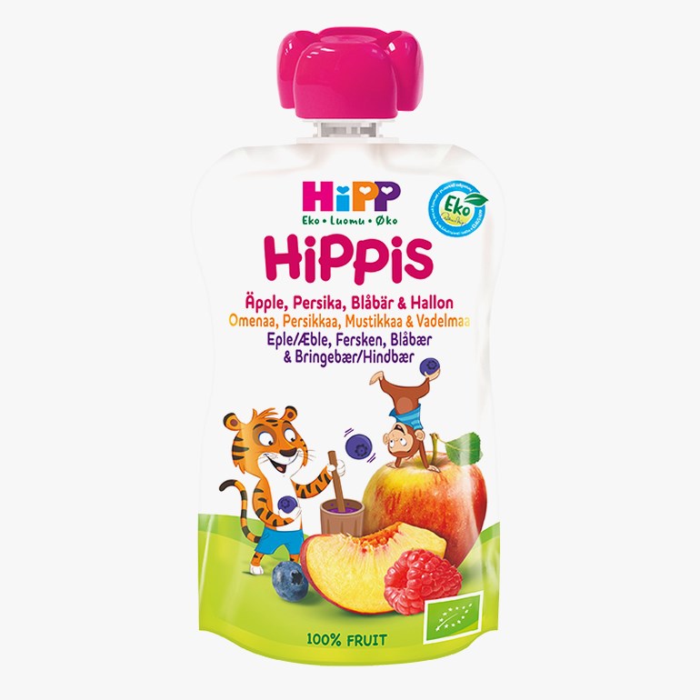 Smoothie Hippis er kun laget av de beste økologiske råvarene og utgjør det perfekte mellommåltid eller dessert om du skulle være hjemme eller på farten. Etter åpning oppbevares forpakningen utilgjengelig for barn og kan stå 24 timer i kjøleskapet med kork. Både kork og pose sorteres som plast i kildesorteringen. 100g Finnes i smakene: -eple, fersken og blåbær -eple, banan og jordbær